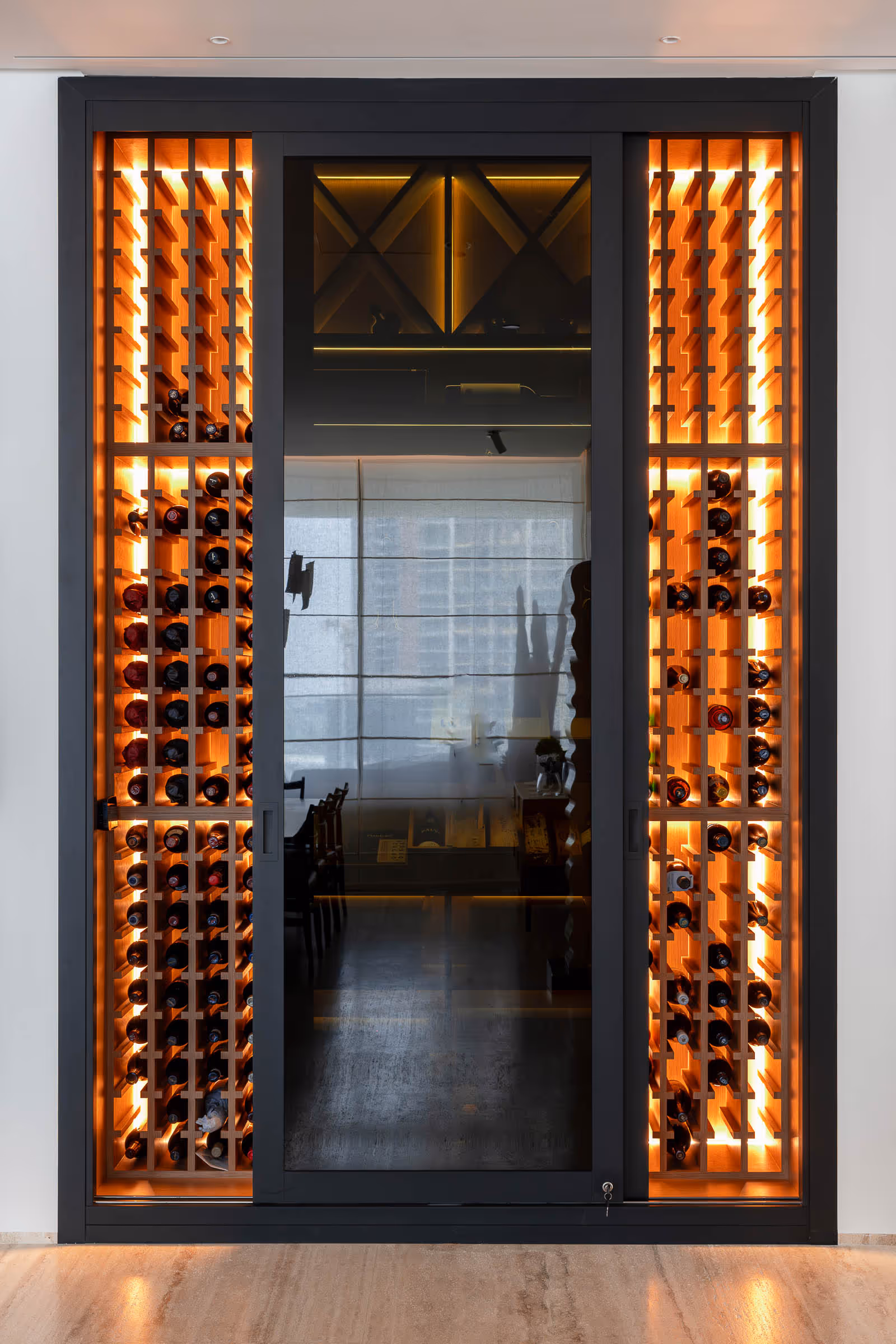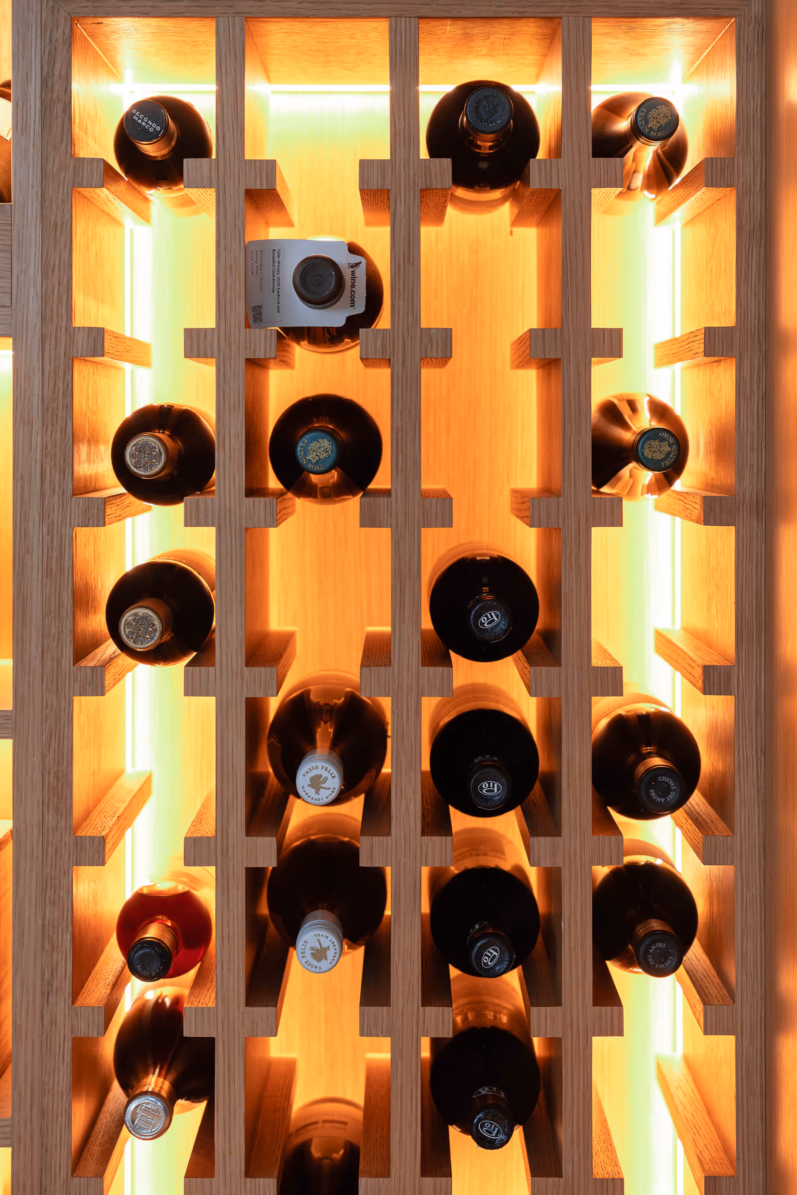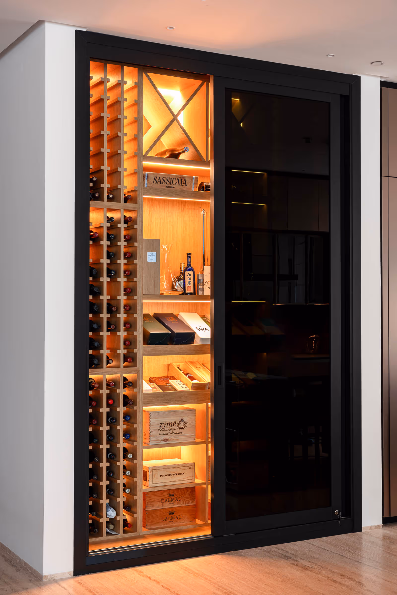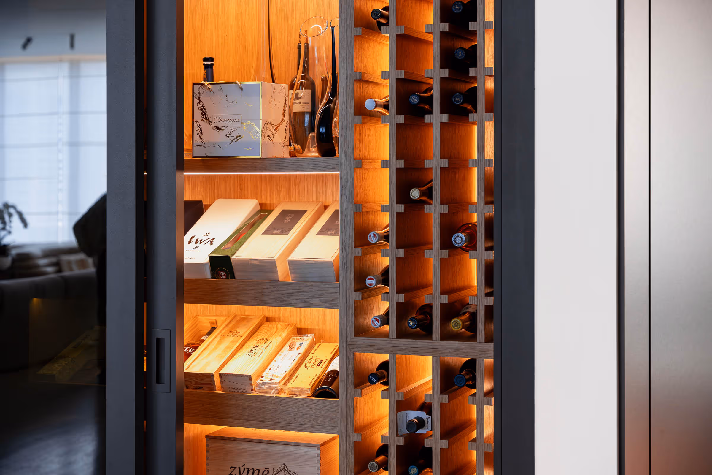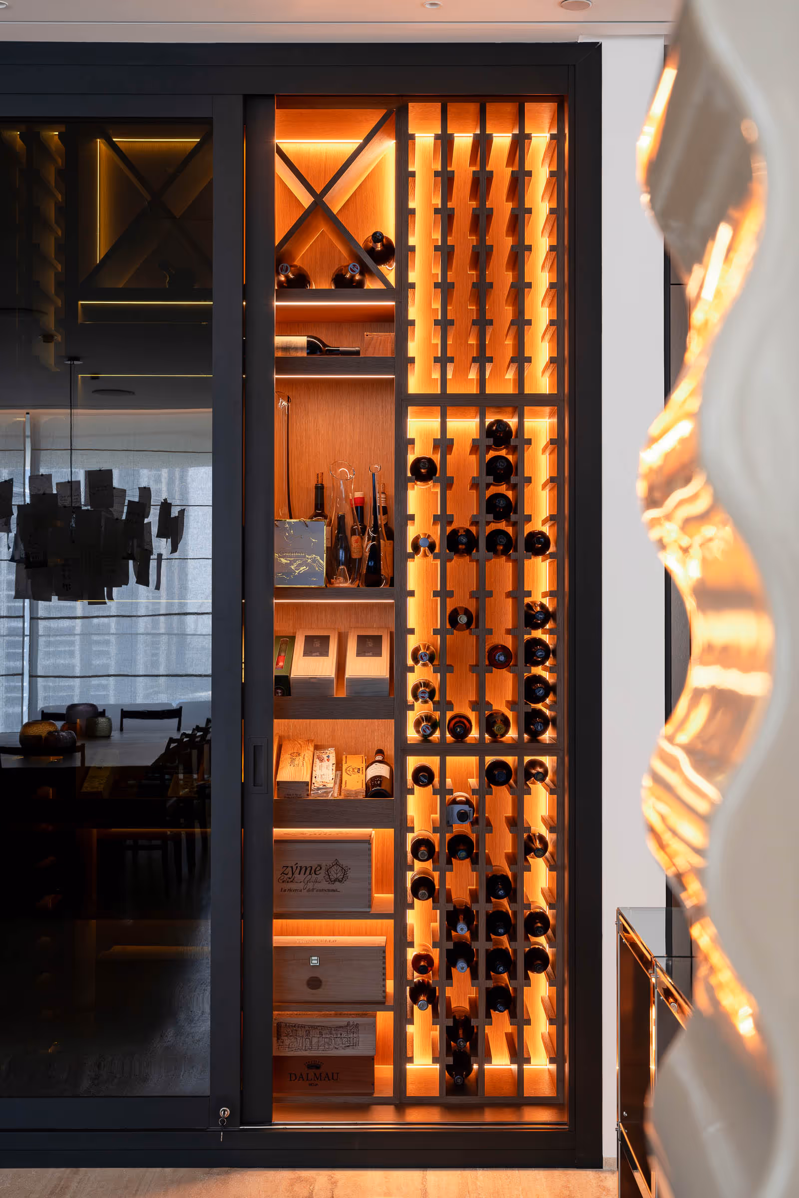 Nestled between the kitchen and living area, this refined display was designed by an architect looking for a sleek, functional solution. The result: a modern composition that plays with smoked glass and wood to blend seamlessly into the heart of the home.