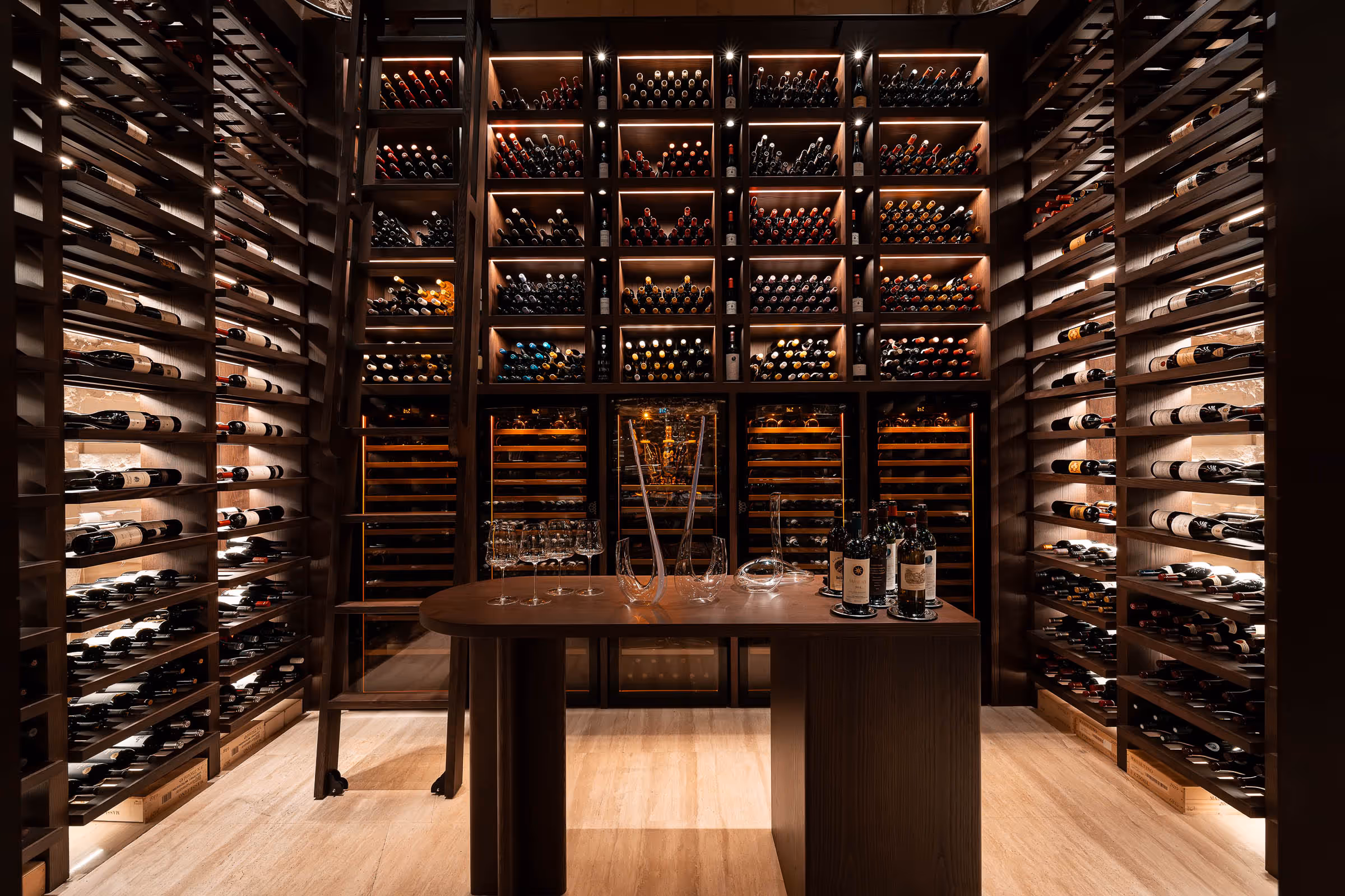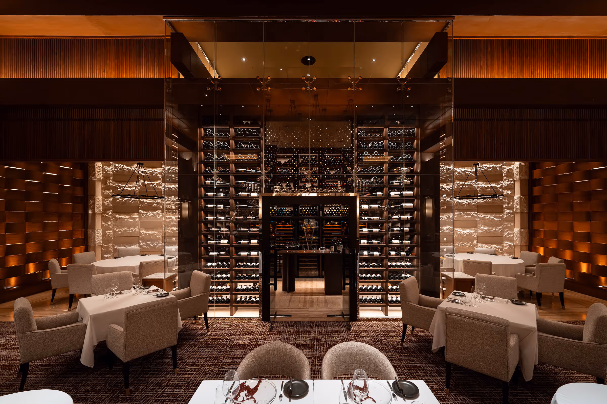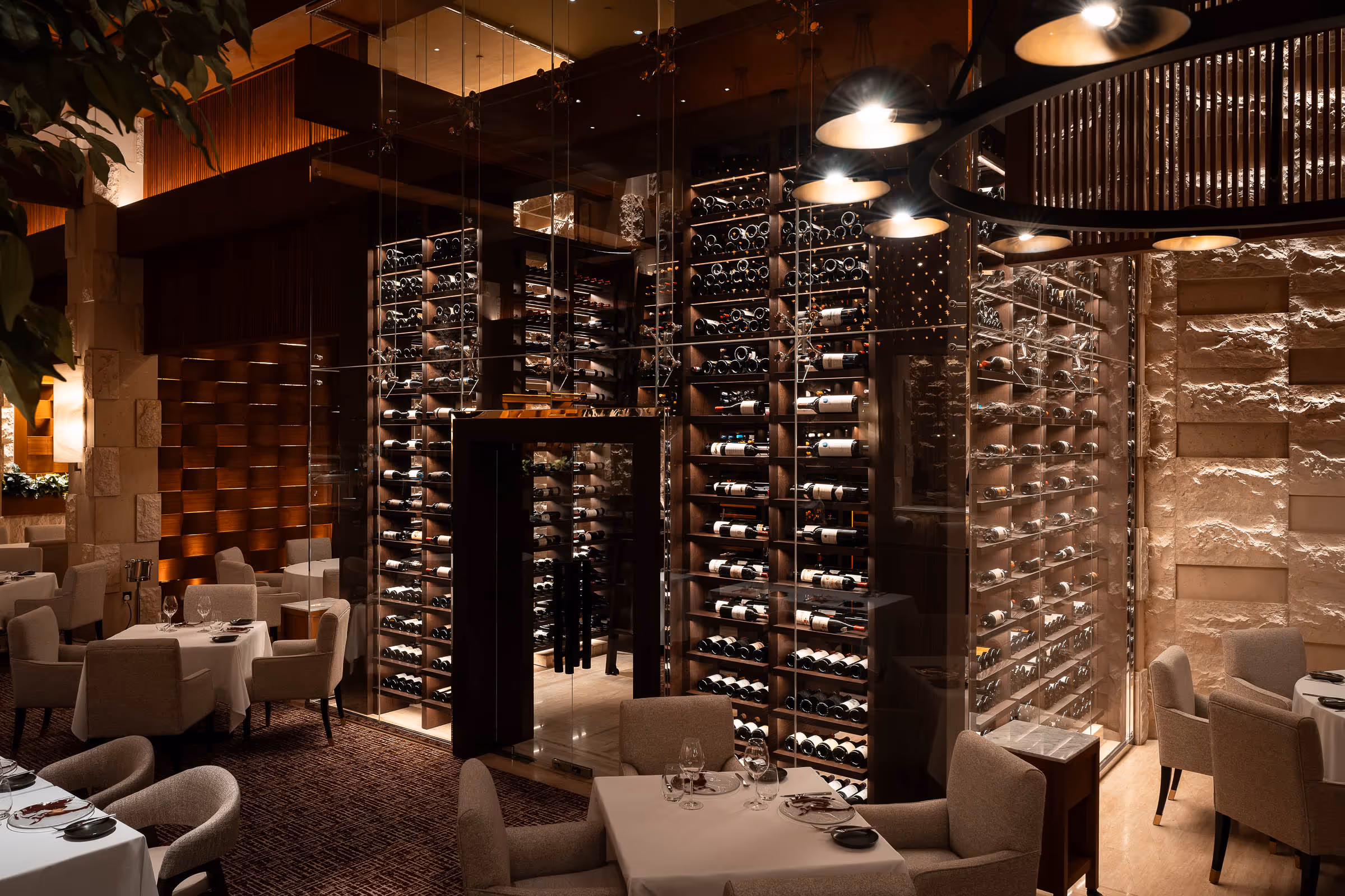 A true centerpiece at Sea Fire, Atlantis Dubai. This bespoke walk-in wine cellar stands 4 meters tall and holds over 2,500 bottles behind full glass walls. Designed with a central tasting bar, it offers an immersive experience where craftsmanship and passion for wine meet in perfect harmony.